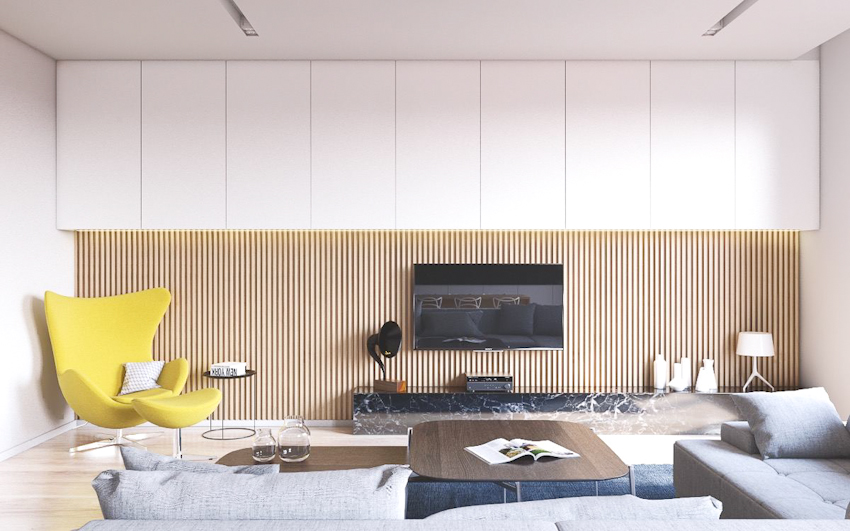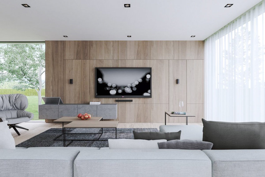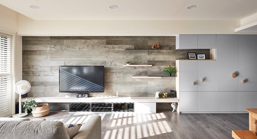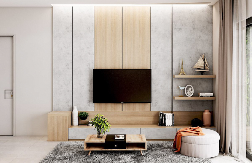 Không gian nhà bạn trở nên sang trọng và ấm cúng với bức phông ốp gỗ hiện đại, phong cách tối giản làm nền nổi bật chiếc ti vi và các vật dụng trang trí khác.