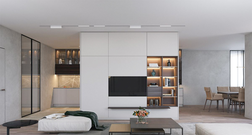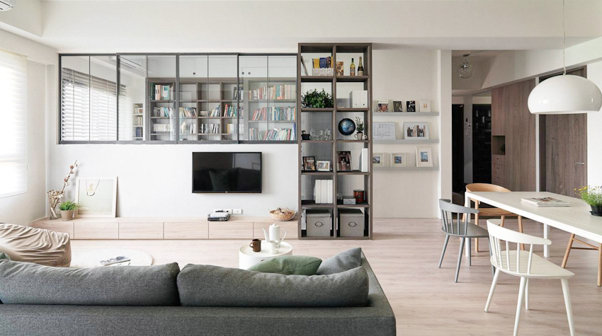 Hệ thống tủ kệ được thiết kế như vai trò bức ngăn giữa hai không gian sống