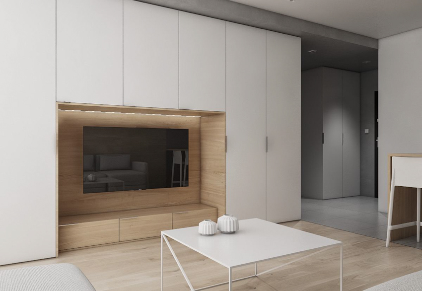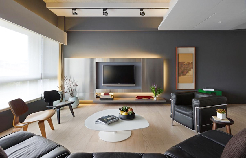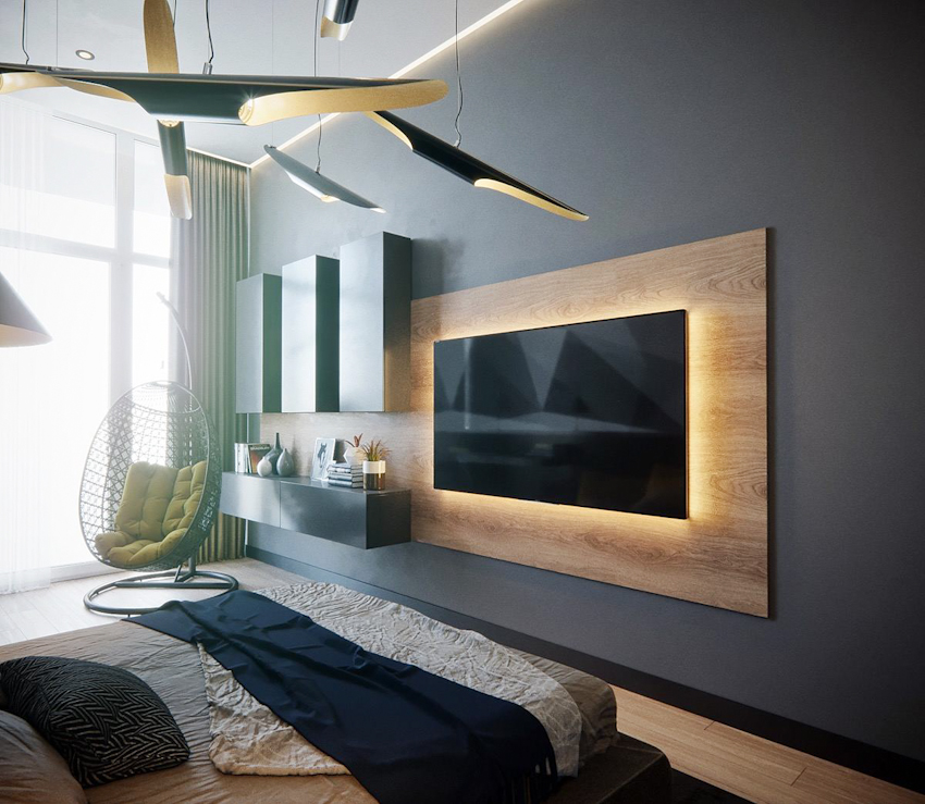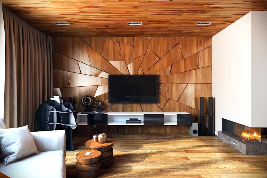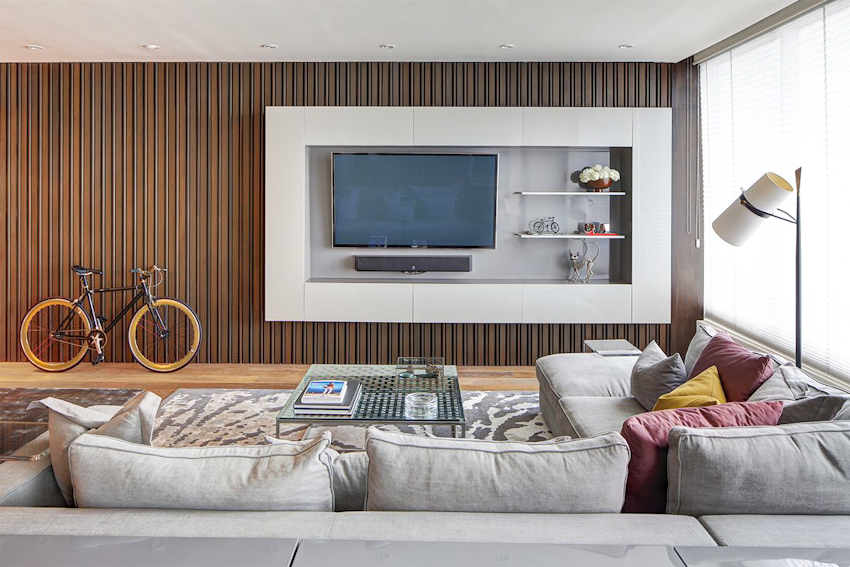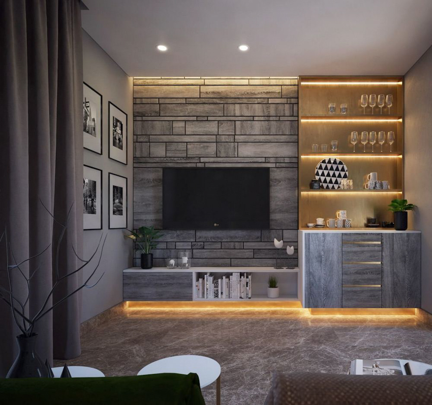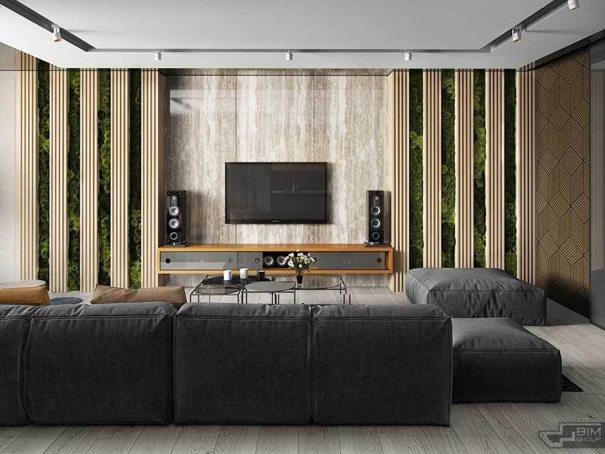Sử dụng mảng gỗ ốp tường với màu tự nhiên kết hợp với khối tủ kệ tối màu, hệ thống đèn ẩn giúp không gian phòng thêm ấm áp
