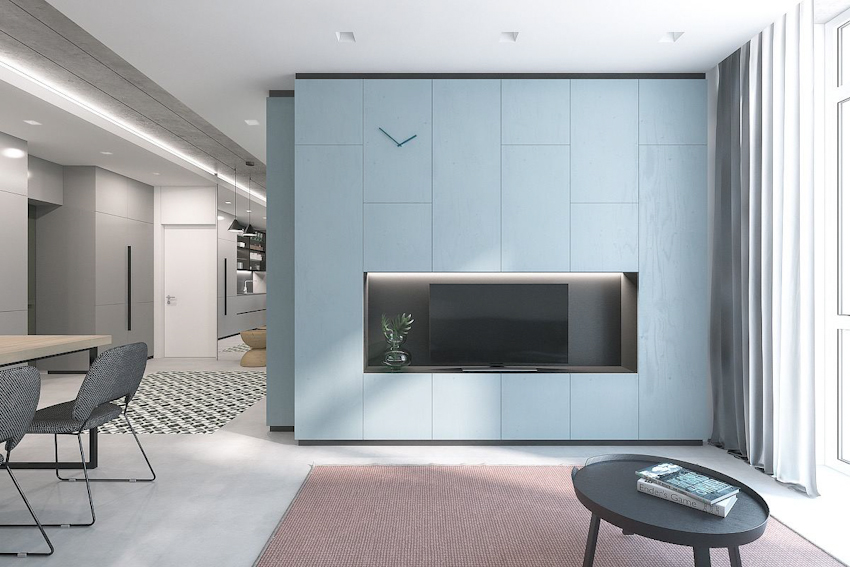 Ở thiết kế này, tivi được đặt chìm trong tường trang trí tạo nên sự sang trọng cho không gian phòng khách.