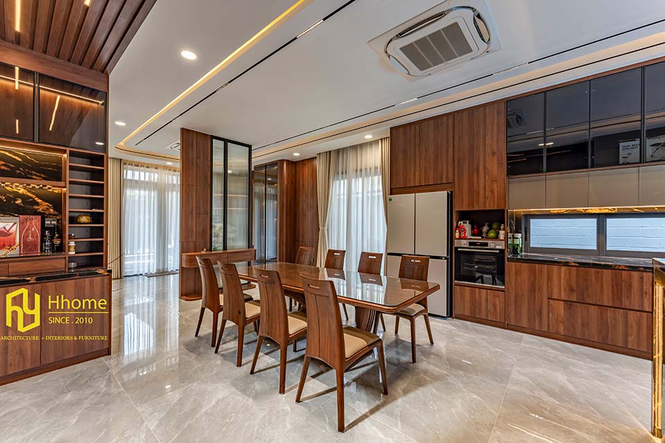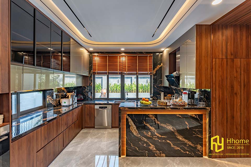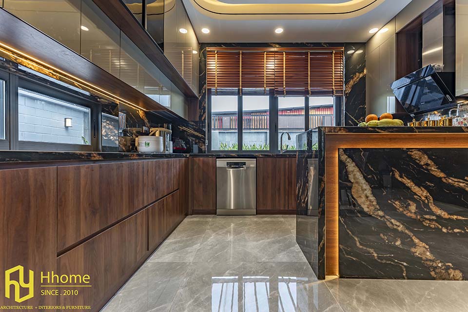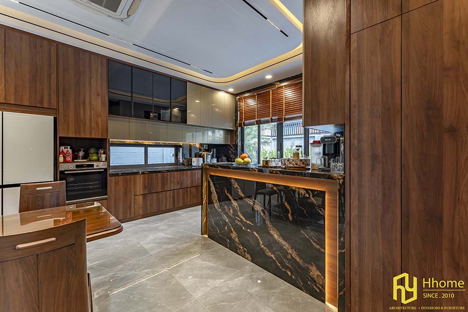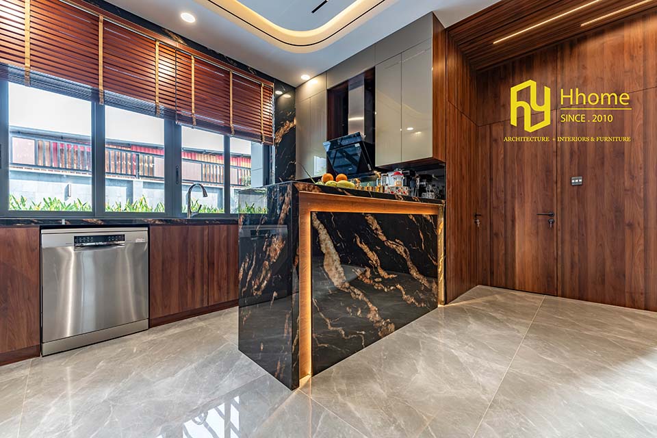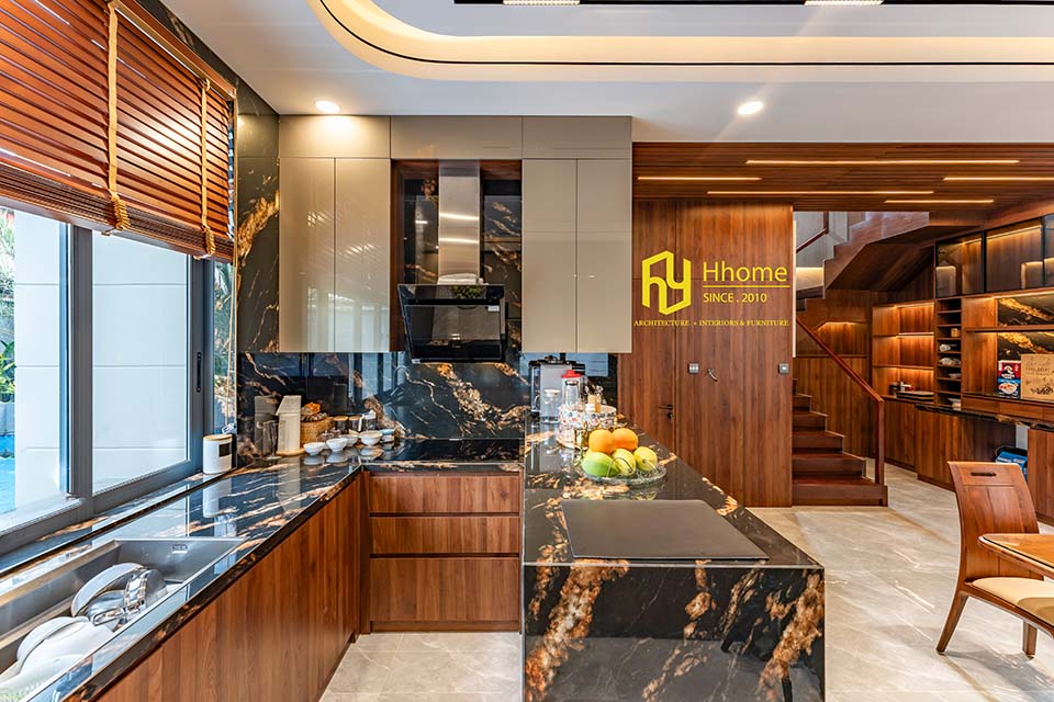 Bề mặt gỗ tự nhiên là đặc điểm nổi bật của một nhà bếp hiện đại nhưng mộc mạc. Tủ bếp gỗ với những cánh cửa gỗ được kết hợp với những tiện nghi hiện đại để tạo ra một cảm giác của một biệt thự nghỉ dưỡng trong nhà bếp ở dự án nhà phố quận 9 này.