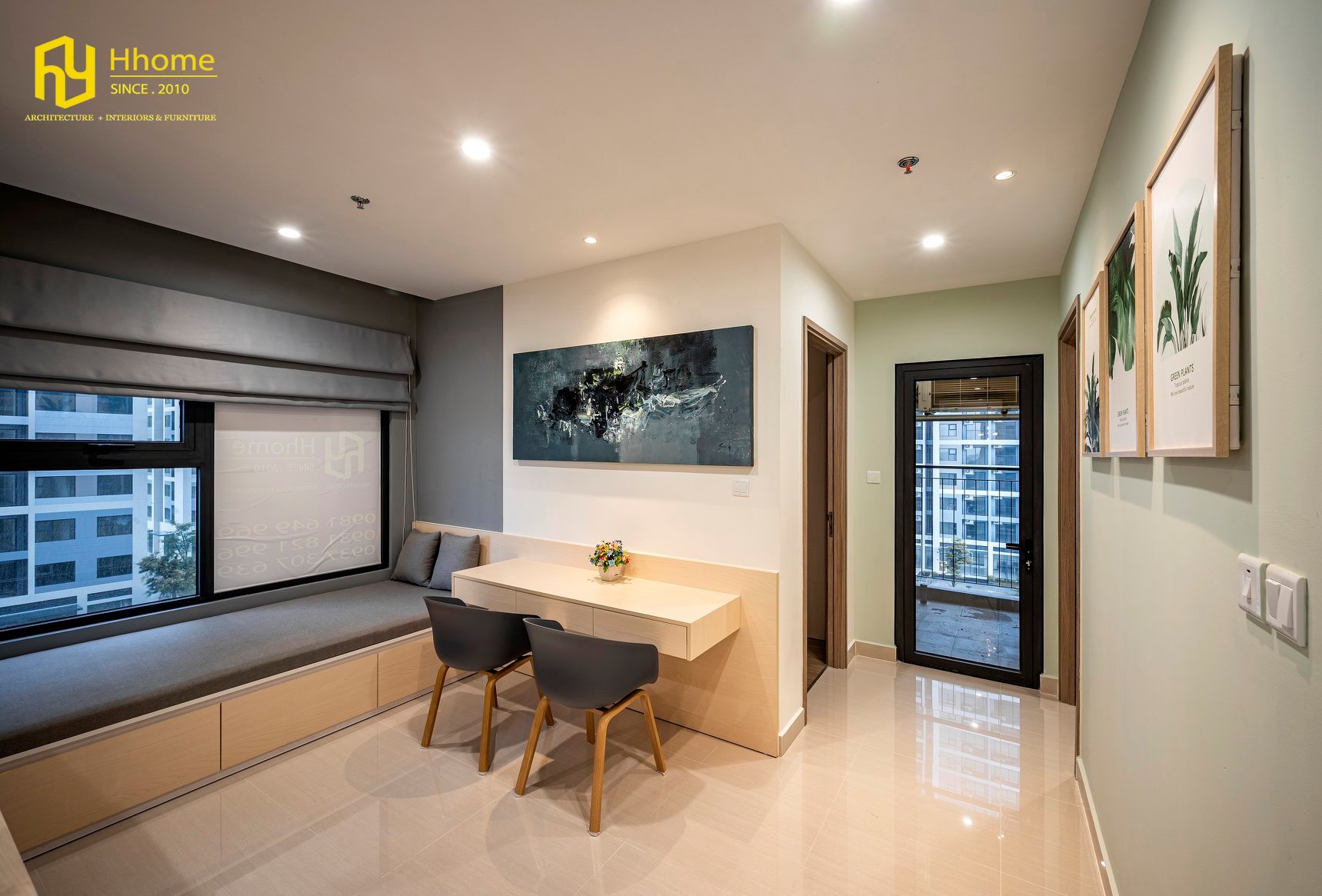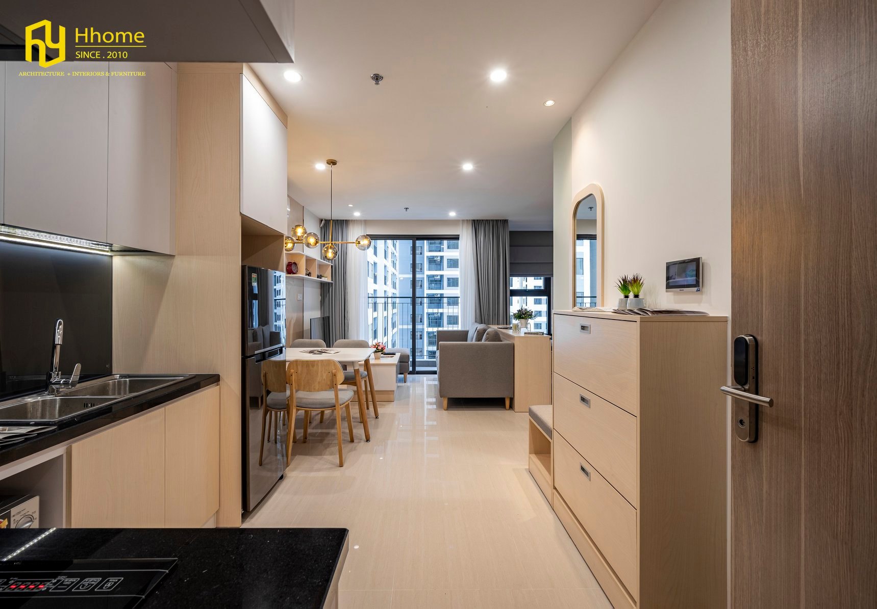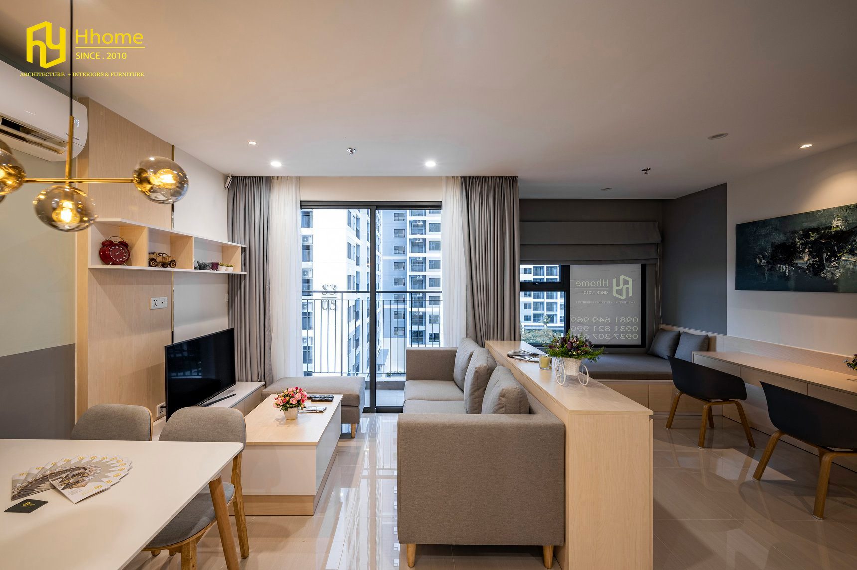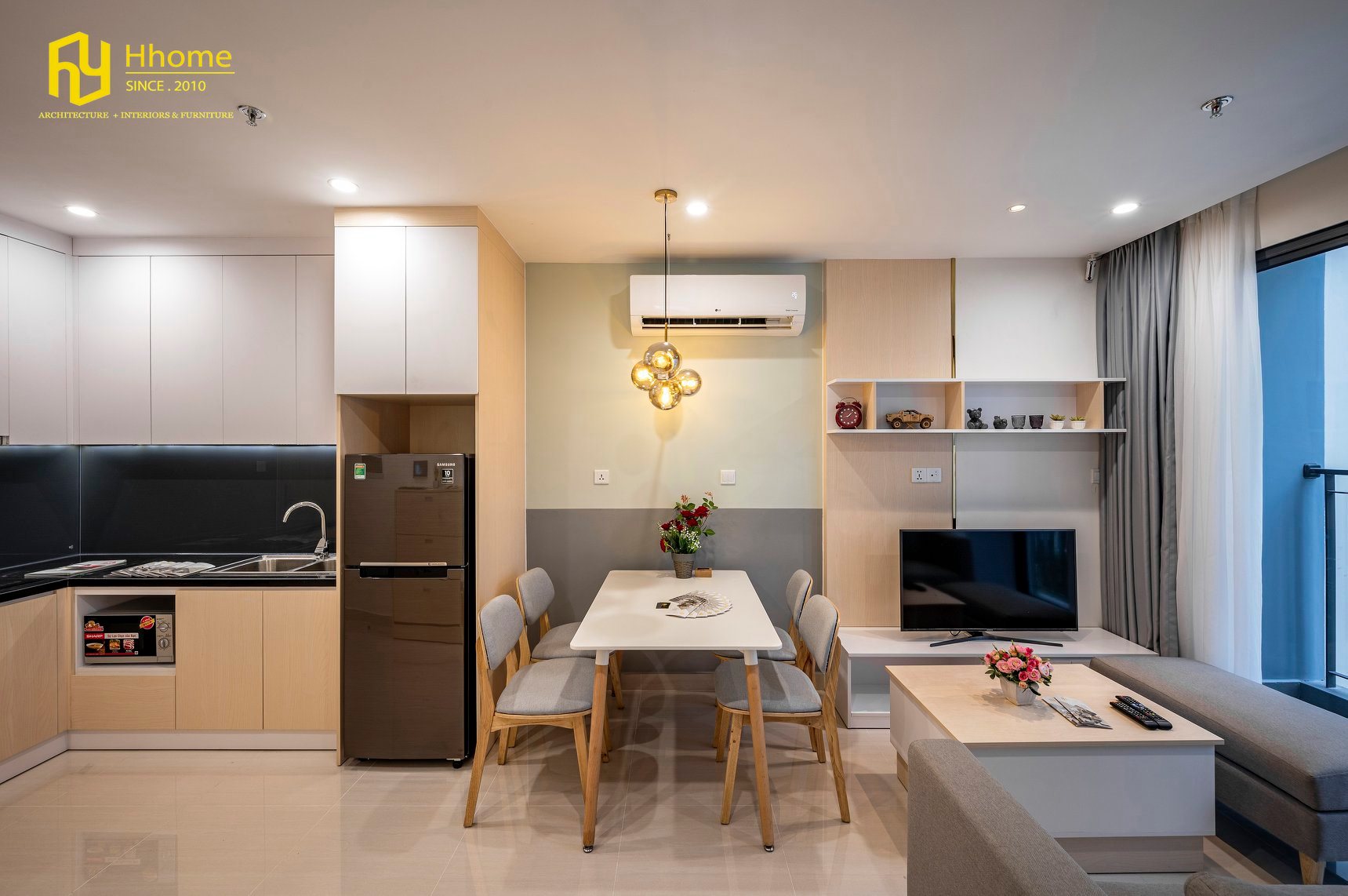 Với tầm nhìn thiết kế hiện đại, vận hành được nhiều phong cách và cấu trúc, cân bằng giữa sự thoải mái với sự sáng tạo và chức năng, Hhome đã mang điều này vào các phòng khách mà mình thiết kế. Bằng cách kết hợp các màu trung tính với nhiều chi tiết màu gỗ, Hhome khiến không gian căn hộ nhỏ này trở nên dễ chịu, thoáng mát và sáng sủa nhưng cũng ấm áp và dễ chịu.