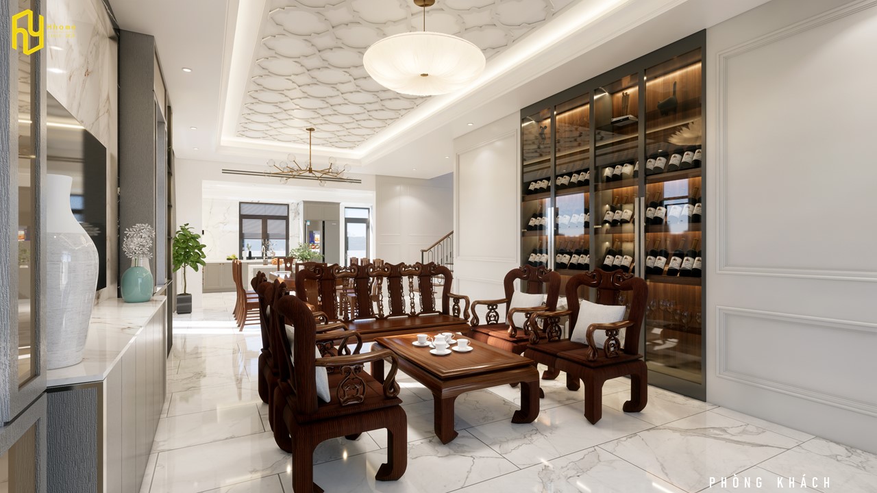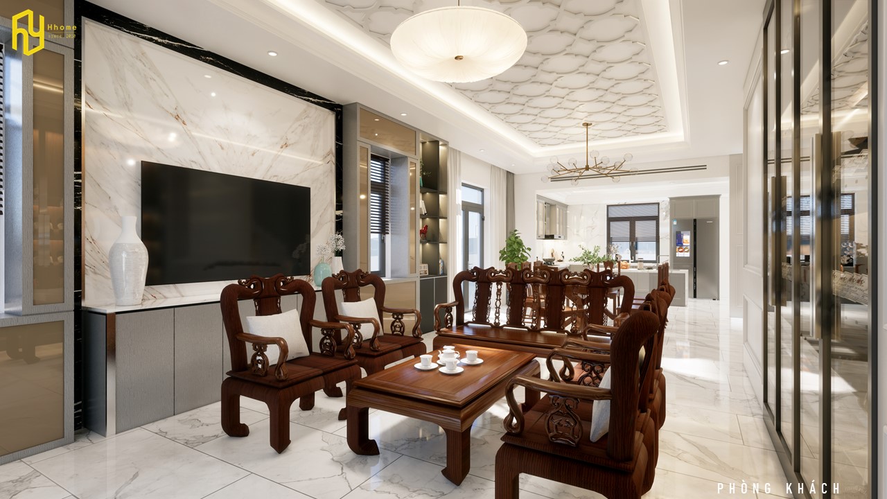 Thiết kế phòng khách này của Hhome tạo được ấn tượng sâu sắc bởi vẻ đẹp hài hòa nhưng không quá chói mắt. Sự kết hợp giữa các màu sắc trung tính nhã nhặn, hiện đại cùng chi tiết ghế gỗ mang hơi hướng truyền thống đã giúp phòng khách trở nên đặc sắc hơn rất nhiều.