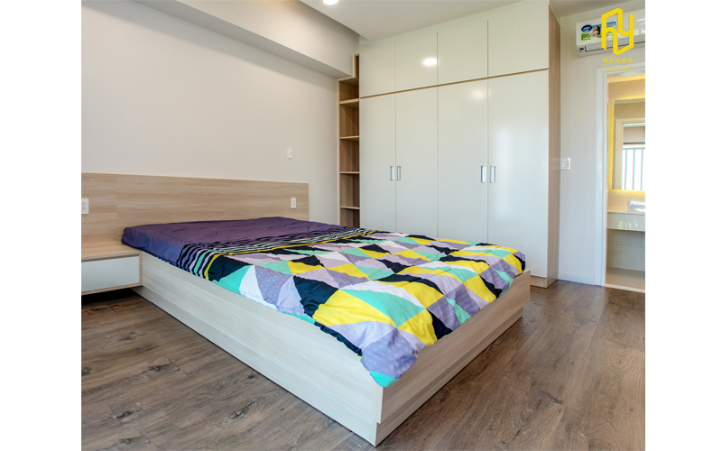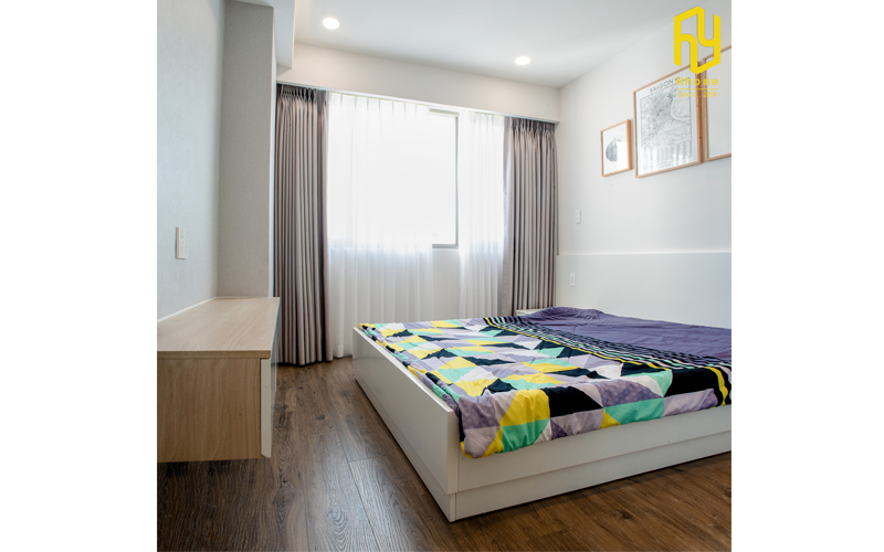 Phòng ngủ Master được Hhome lựa chọn tông màu sáng, nhẹ nhàng kết hợp với gam màu gỗ tự nhiên , rèm cửa , drap giường làm điểm nhấn cho căn phòng. trong 1 căn hộ nhỏ, phòng ngủ master vẫn luôn đầy đủ nội thất và tiện nghi khi sử dụng. Với một bàn trang điểm Gia Chủ có thể kết hợp bàn làm việc.