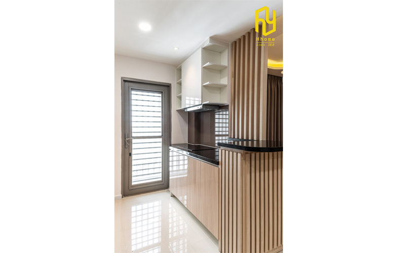 Không gian phòng khách - bếp sử được thiết kế theo hướng không gian mở, tạo cảm giác không gian rộng và thoáng. Cùng với không gian mở tạo không gian rộng thì khu bếp lại được bố trí rất hài hòa, gọn gàng và hợp lý cho người sử dụng. Gian bếp gọn gàng nép vào bên trong, bên ngoài bố trí thêm một quầy bar cao điểm nhấn bởi các thanh lam tinh tế nhẹ nhàng kiêm chức năng kệ tủ vừa tiện lợi để các thành viên trong gia đình cùng quây quần và tăng thêm diện tích lưu trữ đồ đạc ở phòng bếp.