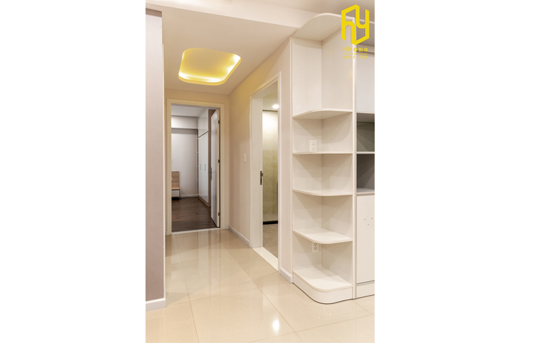 Lối đi hành lang cũng không vì thế mà quá đơn điệu, nhưng Hhome tạo điểm nhấn qua hệ kệ trang trí bo góc và phần trần giật cấp hắt đèn không quá cầu kì mà tạo cảm giác khá thoải mái.